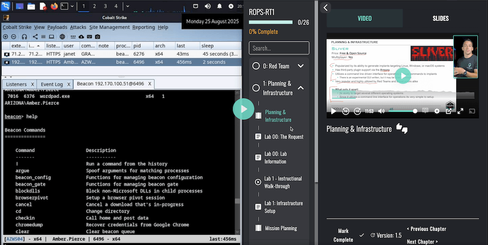 Watch studio-grade lectures and follow along in Lab reviews to master the Red Team TTPs that underpin successful assessments.
